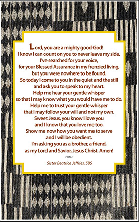 These postcard-sized prayer cards feature Kente cloth designs and are a perfect resource to promote all vocations in a variety of settings. The front of the prayer card contains a moving prayer by Sister Beatrice Jeffries, S.B.S. and the back has scripture verses from 1 Kings 19:11-12.