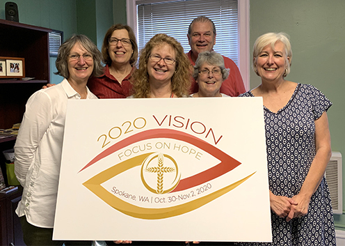 NRVC staff and contract staff show off the winning logo design for the convocation to be held in 2020 in Spokane, Washington. From left: Marge Argyelan, database administrator; Carol Schuck Scheiber, publications editor; Maureen Cetera, director of finance and human resources; Phil Loftus, director of development; Sister Deborah Borneman, SS.C.M., director of member relations and services; and Patrice Tuohy, CEO of TrueQuest Communications, which oversees NRVC communications.