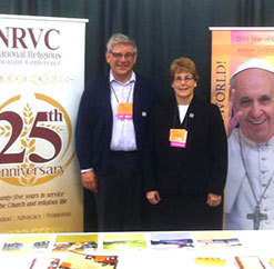Brother Paul Bednarczyk, C.S.C. and Sister Debbie Borneman, SS.C.M. at the NRVC exhibit table at the LCWR assembly. |