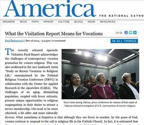 Brother Paul Bednarczyk, C.S.C., executive director of NRVC, was invited by America magazine to share his thoughts on the vocation impact of the December 16 Apostolic Visitation Report. He emphasized that although the numbers are fewer than in the past, some 1,200 women are in religious formation in this country, and several thousand others are in serious discernment.