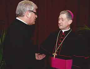 Brother Paul Bednarczyk, C.S.C. greets the newly installed Archbishop Blase Cupich of Chicago after his installation Mass. |