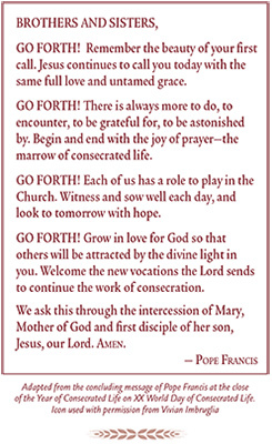 These new prayer cards make a beautiful giveaway at vocation events or to send with jubilee announcements or thank you letters. The art is by iconographer Vivian Imbruglia, and the words are derived from Pope Francis' message at the conclusion of the Year of Consecrated Life.